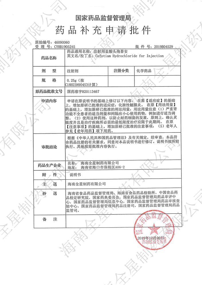經過公司研發團隊長期循證醫學研究,并結合上市原研藥品使用說明書,我公司向國家藥品監督管理局提交的注射用奧美拉唑鈉、注射用鹽酸頭孢替安(4種規格)和注射用頭孢呋辛鈉(3種規格)適應癥的補充申請近日獲得批準,新核準的藥品使用說明書拓展了臨時用藥范圍,用法用量描述更詳細更為安全,提供了更加嚴謹的用藥依據,有助于臨床醫生在一線工作中制定出更準確、更有效、更有針對性的治療方案。今后,公司將繼續提高研發力量,加強技術生產工藝,嚴把質量關口,為市場提供更多高品質、高標準的優質產品,為2030年健康夢中國夢添磚加瓦,獻上我司的一份努力。